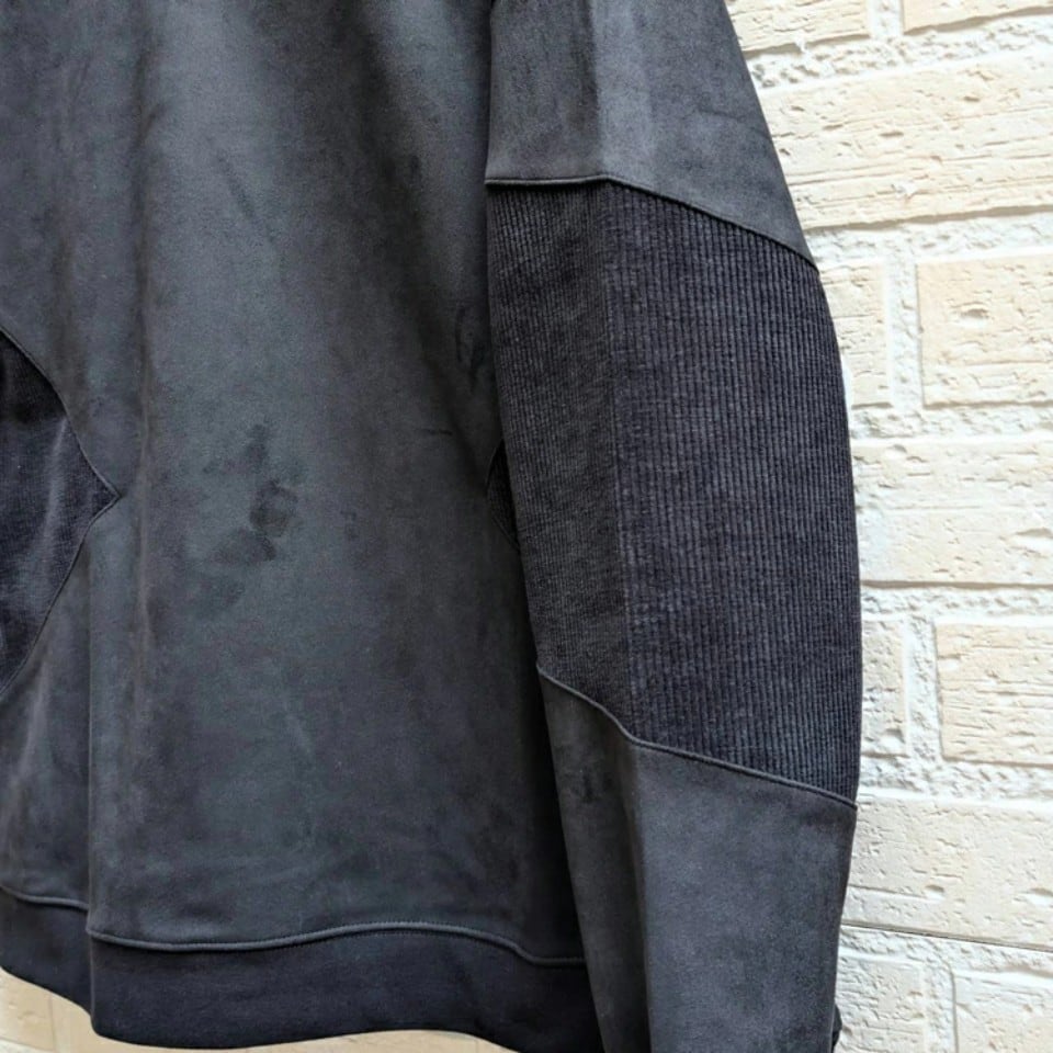 フェイクスウェードと同色系のコーデュロイ素材を組み合わせた、表情豊かなクルーネックスウェット。