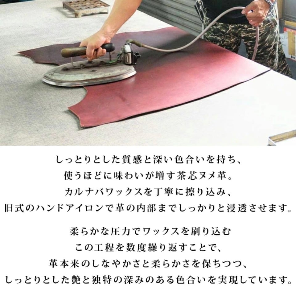 仕上げにはカルナバワックスを何度も丁寧に擦り込み、旧式ハンドアイロンでゆっくりと熱を与えながら革内部まで浸透させています。