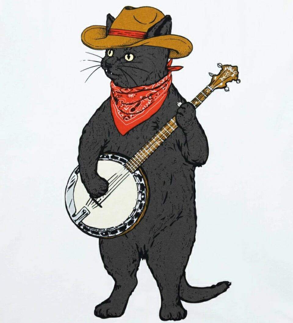 テンガロンハットを被り、軽やかな音を奏でるバンジョー奏者の猫が、遊び心たっぷりに描かれています。
