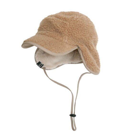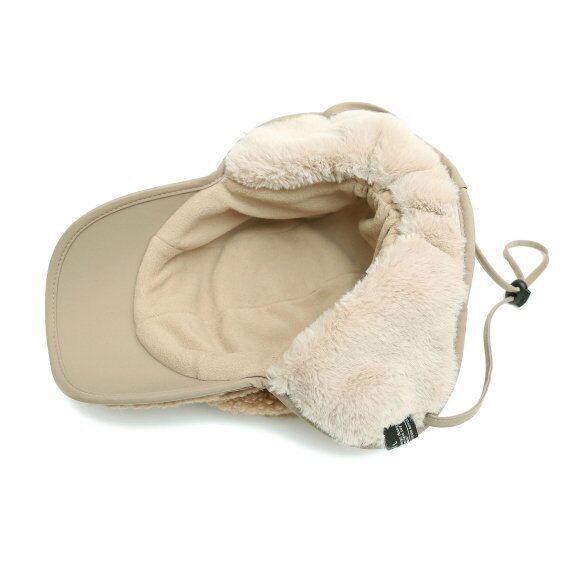 表と裏で毛足の異なるボア生地を使用した耳当て付きキャップ。ふんわりと包み込むような暖かさで冬場に重宝します。
