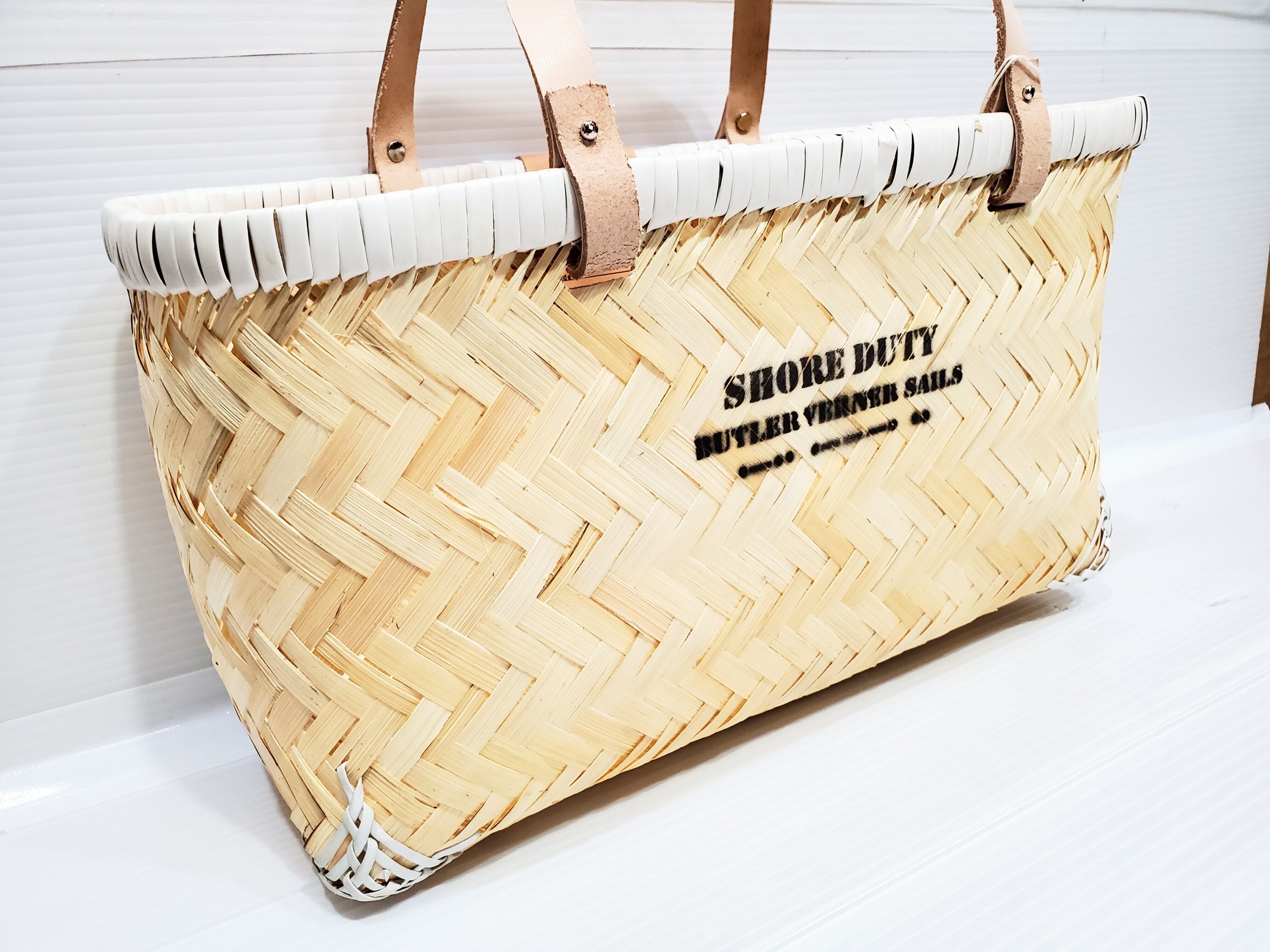 昭和を感じるノスタルジックな籠に革とステンシルを合わせ、