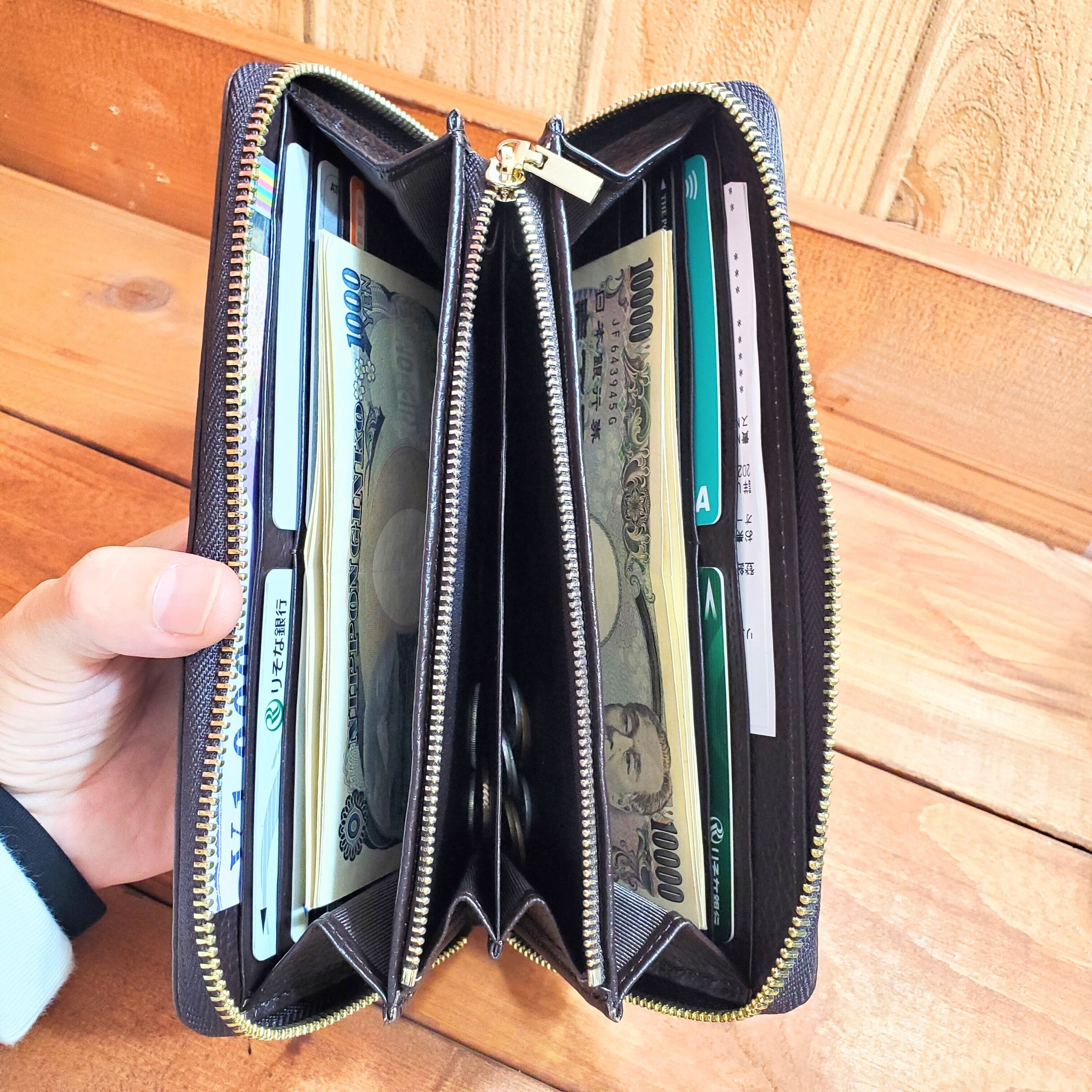 2室構造、センターファスナー小銭入れ(仕切り有り)カードポケット×15、フリーポケット×2